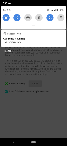কল-ধারনা আপনার ফোনে একটি পরিষেবা চালায় এবং আপনার ফোনটি কিনা তা নির্ধারণ করতে আপনার ফোনে একটি পরিষেবা চালায়আপনার পকেটে হয়।যখন একটি ইনকামিং কল সনাক্ত হয়, কল-অর্থে আপনার ফোনের স্ক্রীনটি বন্ধ হয়ে যাবে এবং যখন আপনি আপনার পকেট থেকে আপনার ফোনটি মুছে ফেলবেন, তখন আপনার স্ক্রীনটি চালু করুন যাতে আপনি এটির উত্তর দিতে পারেন।