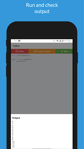 Pyrun একটি টুল যা ডেভেলপারদের তাদের মোবাইল ডিভাইসে Python কোড চালানোর সাহায্য করে।আপনার কোড লিখুন, কাস্টম ইনপুট যোগ করুন, এবং এটি চালানো।