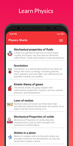 এটি একটি নিখুঁত অ্যাপ্লিকেশন, যে শিক্ষার্থীদের পদার্থবিজ্ঞানের হোমওয়ার্ক অ্যাসাইনমেন্টে সহায়তা প্রয়োজন বা কেবল পদার্থবিজ্ঞান শিখতে চান তাদের জন্য সূত্র, সমীকরণ এবং চিত্র দ্বারা পূর্ণ