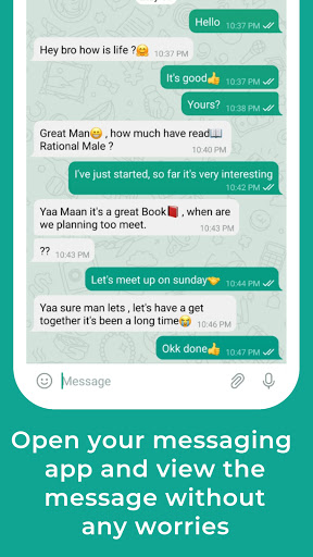 অন্য ব্যক্তি ছাড়া এটি সম্পর্কে বার্তা পড়তে চান? তারপর এই অ্যাপ্লিকেশন আপনার জন্য. কোন দেখা যায় না আপনার কোনও পঠিত প্রাপ্তি, শেষ দেখা, এবং নীল টিক চিহ্ন ছাড়াই আপনার বন্ধুর ইনকামিং বার্তাগুলি পড়তে সাহায্য করে না