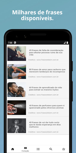 São várias opções para você não perder tempo, por exemplo, você pode encontrar frases de amizade, amor, inveja, motivação, música, reflexão, relacionamento e muitos outros assuntos.
