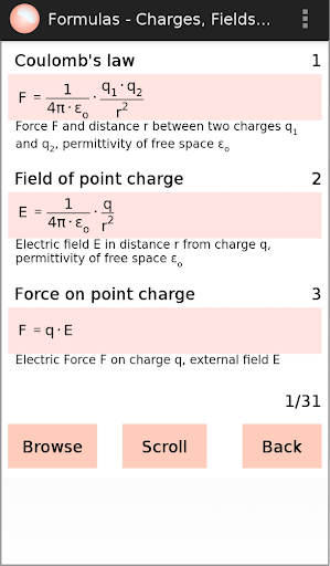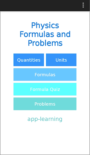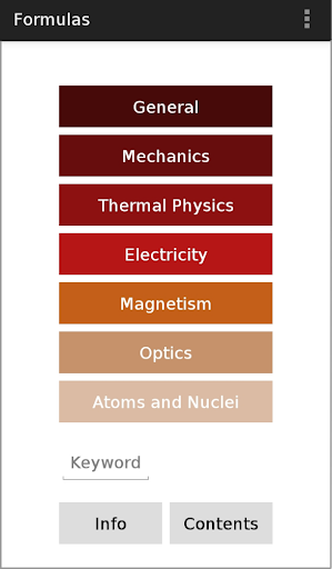 অ্যাপ্লিকেশনের কিছু অংশ তথ্য প্রাপ্তির জন্য এবং কিছু অংশ ব্যায়ামের জন্য। তথ্য অংশটিতে সামগ্রী আইটেম 'সূত্র', 'পরিমাণ' এবং 'ইউনিট' রয়েছে। ব্যায়াম অংশ কন্টেন্ট আইটেম 'সূত্র ক্যুইজ' এবং 'সমস্যা' গঠিত। আইটেম প্রতিটি ক্ষেত্রের মেকানিক্স, তাপ পদার্থবিজ্ঞান, বিদ্যুৎ, চুম্বকত্ব, এবং অপটিক্স অনুযায়ী গঠিত হয়।