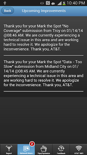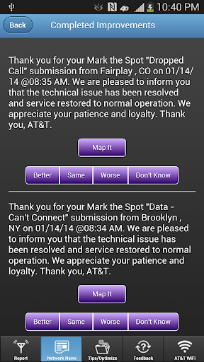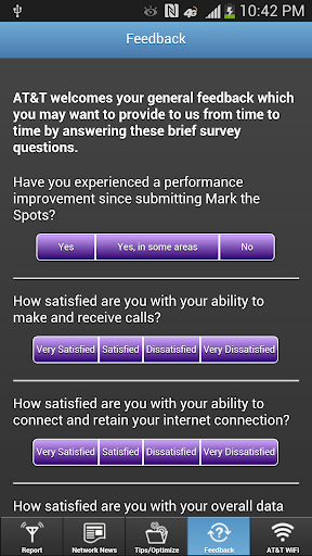 AT&T Mark the Spot is an application that provides customers a means to provide feedback on their network experience to AT&T. AT&T is committed to providing its customers with the best network experience possible.