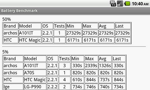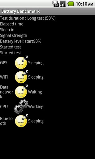 battery benchmark app for android Just select the test type, leave your device alone maybe several hours, and watch it workingThis application simulates a pseudorealistic usage of your phone: GPS, wifi bluetooth CPU, screen, sends and receives data over the network, etc.No data recorded, except the test results e.g. no location recorded.On each iteration you should hear a noise one for screen on mode, an other when the screen is off, when the test is finished the results are send anonymously to a web server where all the battery benchmarks are collected to allow comparisons and you can see all the results on the quot;Resultquot; screen.