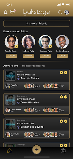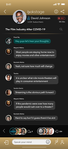 আপনি serendipitously backstage উপর আশ্চর্যজনক মানুষ এবং আশ্চর্যজনক বিষয়বস্তু আবিষ্কার করতে পারেন, যোগ দিতে বা এমনকি বিশ্বের আপনার প্রতিভা প্রদর্শনের জন্য একটিতে আকর্ষণীয় কথোপকথন খুঁজে পেতে পারেন। আপনার বন্ধুদেরকে আমন্ত্রণ জানান, মানুষের একটি বৈচিত্র্যময় গোষ্ঠী অনুসরণ করুন এবং আকর্ষণীয় কথোপকথনগুলি শুরু করুন।