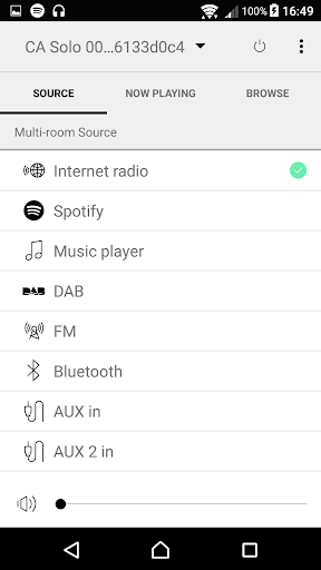 Take wireless touch screen control of your Solo or Duetto with Como Audio's free Como Control App for Android smart devices. Our ad-free App allows you to choose your source, control the volume level, view Internet radio station and Spotify Connect artwork, see metadata (if available), tune stations, adjust the equalization, activate the Sleep timer, set the Time, power on and off, and even set a background color theme.