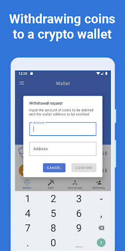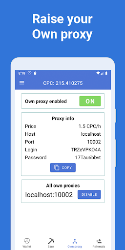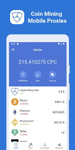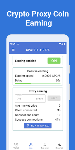 মুদ্রা মাইনিং - মোবাইল প্রক্সি অর্থ উপার্জনের জন্য একটি অ্যাপ্লিকেশন ইন্টারনেটে. ব্যবহারকারী একটি প্রক্সি সার্ভারের মাধ্যমে নেটওয়ার্কে এগিয়ে যান। ইন্টারনেট ক্রিয়াকলাপের জন্য, সিপিপি টোকেন অ্যাকাউন্টে জমা দেওয়া হয়।