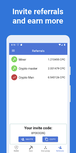 অ্যাপ্লিকেশনটি একটি রেফারেল প্রোগ্রাম বোঝায়। লিঙ্কটি অনুসরণ করে নিবন্ধিত প্রতিটি নতুন ব্যবহারকারী খনির গুণক বৃদ্ধি করে। মুদ্রা খনির - মোবাইল প্রক্সিগুলিতে, 2 উপার্জন মাত্রা রয়েছে: