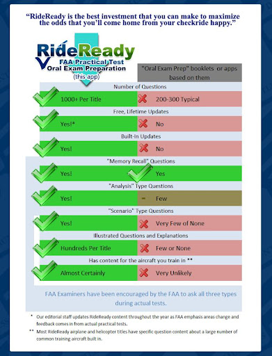আমাদের রাইডেডি অ্যাপ্লিকেশনটি আপনাকে কোনও বই বা ডিভিডি দিতে পারে এমন গতি, শক্তি, প্রাপ্যতা এবং নমনীয়তা সরবরাহ করতে পারে। উদাহরণস্বরূপ, আপনি রাইডিডি বলতে পারেন যা আপনি উড়ে যাচ্ছেন (সাধারণ প্রশিক্ষণ বিমানের একটি তালিকা থেকে) এবং রাইডিডি আপনাকে তার সিস্টেম এবং ক্রিয়াকলাপগুলিতে প্রশ্ন জিজ্ঞাসা করবে - ঠিক যেমন প্রকৃত পরীক্ষক উইল। মনে রাখবেন: বইগুলি যে মুহূর্তে মুদ্রিত হয় সেটি থেকে বইগুলি শেষ হওয়ার পরে, আপডেটগুলি জীবনের জন্য বিনামূল্যে, অর্থাত্ আপনি বিল্ট-ইন আপডেট মেকানিজমের মাধ্যমে দ্রুত এবং সহজেই দ্রুত এবং সহজে পেতে পারেন।