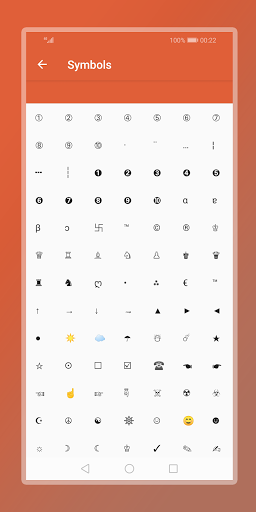 - Symbols : Includes a list of best symbols. ( Tap on any symbol to copy it to the clipboard. Then past it on any app you want).