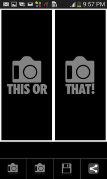 This of That Camera a fun camera app that lets the user make a two pic picture using your device's camera or saved gallery images. Create pics for shopping, choosing outfits, prom dresses, what to eat, where to go or really whatever. Simply make the picture in the app and ask your friends "THIS OR THAT?" by sharing with your friends on facebook, twitter or send a private email or text.