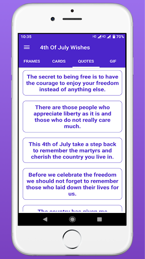 এই অ্যাপ্লিকেশনটি 4 জুলাইয়ের জন্য শুভেচ্ছার জন্য উপযুক্ত অ্যাপ্লিকেশন।এই অ্যাপ্লিকেশনটিতে গ্রিটিংস কার্ডগুলির একটি দুর্দান্ত সংগ্রহ রয়েছে এবং এই 4 জুলাইয়ের জন্য শুভেচ্ছা রয়েছে।এই অ্যাপ্লিকেশনটি ব্যবহার করে আপনি আপনার প্রিয়জনকে শুভেচ্ছা বা শুভেচ্ছা পাঠাতে বা ভাগ করতে পারেন