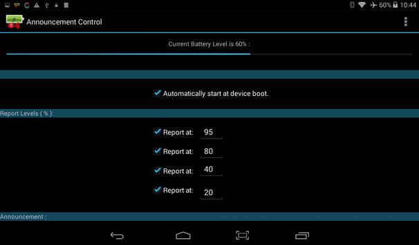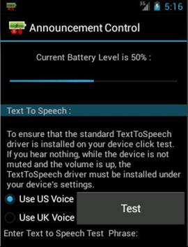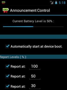 This Android application, suitable for most Android devices new and old, will report the battery level of the device via the text-to-speech (tts) driver. It will do so at user specified battery levels in percentage. You may select the voice dialect also. You can set it to start up automatically at device reboot if you prefer your Battery Level Reporter to be always up and running. Since most Android devices will only report very low battery levels, this application is useful for users who would like earlier reporting of battery levels, or hear the actual levels read out. Since you get a verbal readout it is useful when you cant see the screen or don't want to look at it. It is handy for motorcyclists wearing bluetooth headsets connected to their phones.