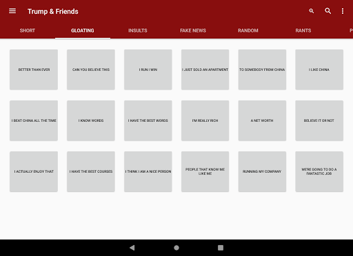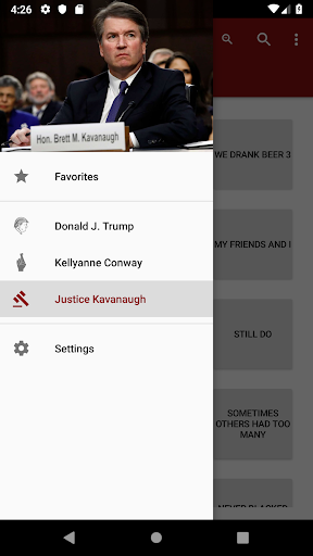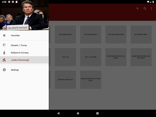 * একাধিক মানুষ থেকে বেছে নেওয়ার জন্য - এখন যেমন, কেল্লানন কনওয়ে, ডোনাল্ড ট্রাম্প এবং ব্রেট Kavanauaugh অ্যাপ্লিকেশন হয়।অ্যাপ্লিকেশনটি এমন একটি উপায়ে তৈরি করা হয়েছে যা লেআউটটিকে গতিশীলভাবে তৈরি করতে দেয় যা ভবিষ্যতে শব্দ বা লোকেদের কাছে যোগ করা সহজ করে তোলে।