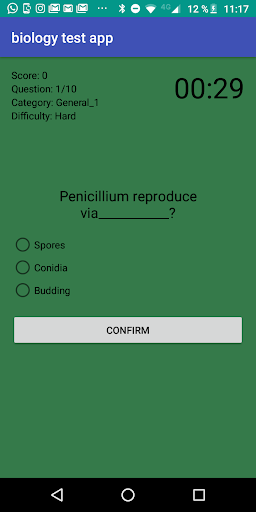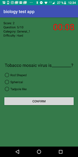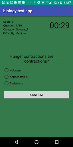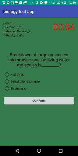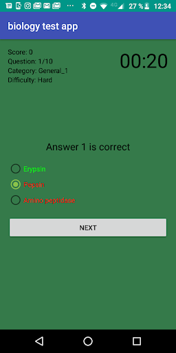 Biology Test App has a simple graphic interface and it is made up of three blocks of biology questions and in turn each block consists of three levels of difficulty: easy, medium and hard. You will have a time of 30 seconds to answer each biology question.