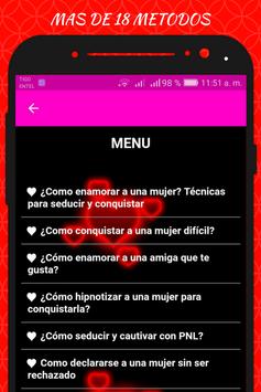 Cada mujer es un mundo diferente, con esta aplicación sabrás por fin como conquistar a una mujer mayor, encontraras las palabras exactas para conquistar a una chica, será sencillo saber cómo seducir a una mujer difícil, tendrás la técnica exacta para enamorar a una mujer casada,
