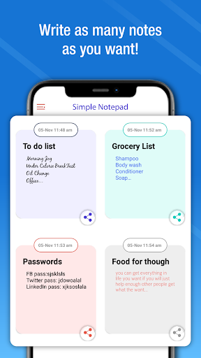 Notepad with sticky notes to organize your thoughts on notebook of this note taking app. Write notes using notepad of the “Simple Notepad – Color Note”
