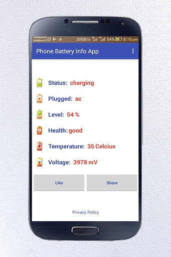 Phone Battery Info App shows Phone's battery percentage, voltage, temperature & health status.