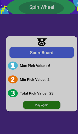 Spin the wheel maximum 5 in a times. And automatic pick random number from the wheel. You can see your Scores after completed 5 spin. In ScoreBoard result will generate max and min pick value with the total pick value.
