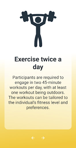 প্রতিদিনের অনুশীলন ট্র্যাকিং: আপনার দুটি 45 মিনিটের ওয়ার্কআউট লগ করুনকমপক্ষে একটি ওয়ার্কআউট বাইরে বাইরে।আপনার ফিটনেস স্তর এবং পছন্দগুলিতে আপনার ওয়ার্কআউটগুলি তৈরি করুন