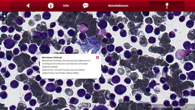 Smart Hematology is the first virtual mobile microscope for hematologists! In this revolutionary app you receive over 100 microscopic slides of leukemia, lymphoma, CMPE, MDS and other diseases. Smart Hematology can be used like a real microscope, with which you can zoom into the virtual slides with your fingers. There are numerous expert comments on all slides and in all zoom levels.