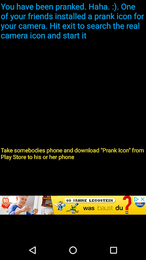 This is a classic prank. The person thinks that he or she is clicking the camera icon but the camera icon was exchanged by you. The new one is a prank icon that shows some lightnings on the screen. Lol. So funny. So with this funny little trick you can hopefully create a laugh. At least on your face. Hahaha. Install this app not on your phone. Get another persons device and then fetch the program there. Then put the cmera icon somewhere to the screen and put the app logo instead where the camera logo was. So now your fake camera icon is there where the user is used to start the photo application. But what then happens is that he sees lightnings flash on the screen. Then a little text appears that this was just a joke. You can enter al little personal message there. Have fun with the cool app prank icon