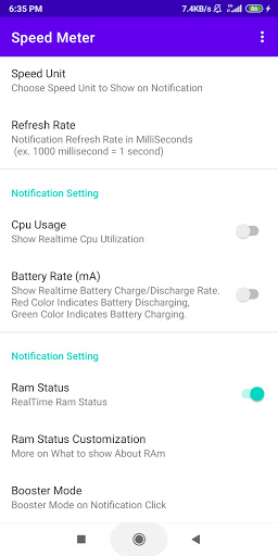 স্পিড মিটার সূচকটি স্ট্যাটাস বারে আপনার ইন্টারনেট গতি প্রদর্শন করে এবং রিয়েলটাইম CPU ব্যবহার, র্যাম তথ্য, ব্যাটারি স্ট্যাটাস দেখায়।এটি আপনাকে আপনার ডিভাইসটি ব্যবহার করার সময় কোনও সময়ে নেটওয়ার্ক সংযোগ নিরীক্ষণ করতে সহায়তা করে।