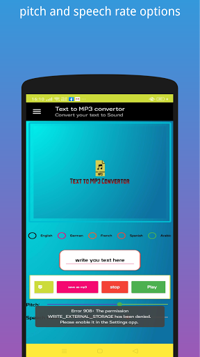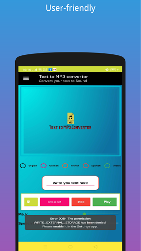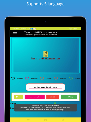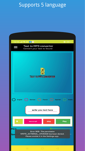 With ability to save it as mp3 file in case you want to listen to it again it supports 5 language English, Arabic, German, French, Spanish with set pitch option and speech rate