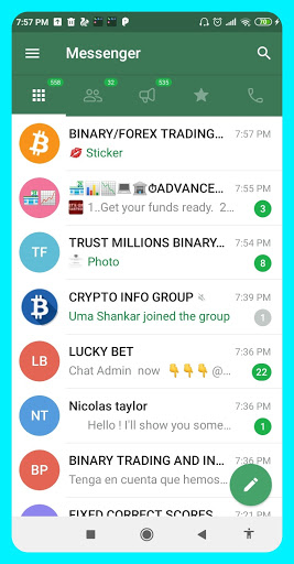 • চ্যাটের জন্য পৃথক ট্যাবগুলি: ব্যবহারকারী, গোষ্ঠী, চ্যানেল, বটস, ফেভারিট, অপঠিত, অ্যাডমিন / সৃষ্টিকর্তা।