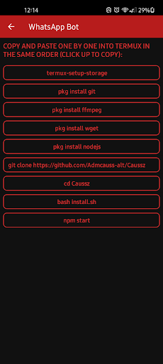 ঠিক আছে, আপনার জন্য বটটি চালানোর জন্য খুব সহজ, কেবলমাত্র এমন কমান্ডগুলি পেস্ট করুন যা টার্মাক্সে (কমান্ড এবং কমান্ড এবং টার্মাক্স ডাউনলোড করার জন্য লিঙ্কটি ইতিমধ্যে অ্যাপটিতে রয়েছে)