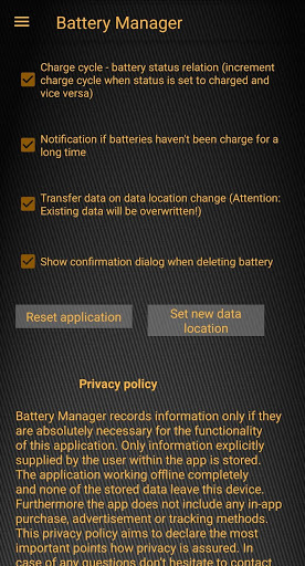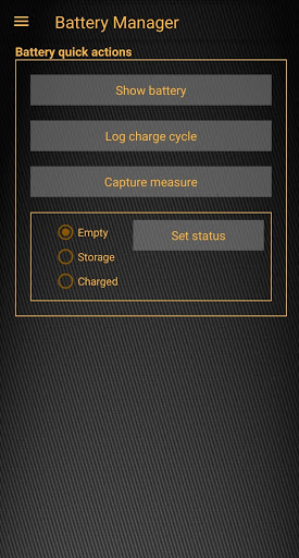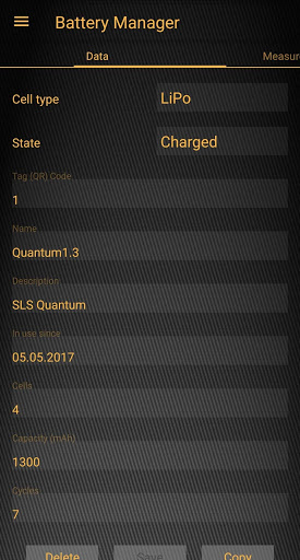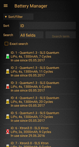 With Battery Manager(BatMan) you can register all your batteries no matter which type (e.g. LiPo, LiIon, LiFePo, NiMH, Hv-LiPo, ...). Each battery gets a QR code which helps you identify it and record measures like charge cycles, inner resistance, effectively charged capacity. If supported by your device you can also use NFC tags.