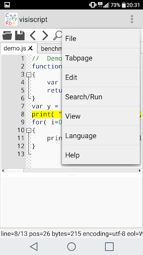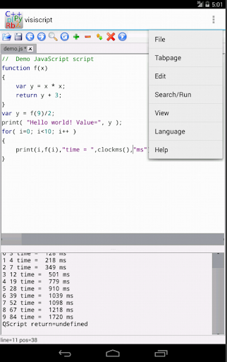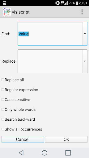 For advanced functions (navigate in source code, find in files, encrypt files, graphical output and debugger support for Python and minscript) and aditional script interpreters (minscript, Lua, Python, Haskell/Hugs, Scheme/Scheme48, newLisp) use the VisiScriptExtensions module: https://www.google.com/url?q=https://play.google.com/store/apps/details?id=de.mneuroth.visiscriptextensions