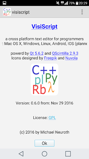 VisiScript is released under the GPL. The sources and binary packages for other platforms (Windows, MacOS and Linux) could be found on the VisiScript homepage http://www.mneuroth.de/projects/Visiscript.html