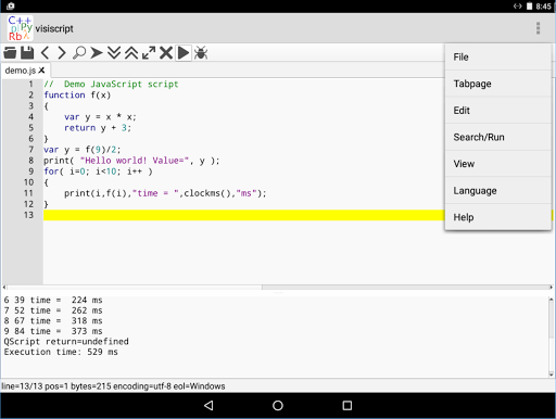 VisiScript is a free and comfortable cross platform text editor for programmers with IDE features and a graphical frontend for script and programming languages like JavaScript/QScript, Python, Ruby, Perl and others.