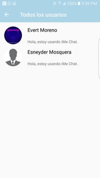 iMe Chat es la nueva aplicación de mensajería instantánea en la que puedes mandar mensajes en cualquier momento del día; actualmente se encuentra en desarrollo, esta es una versión BETA que se lanza con el fin de mejorar teniendo en cuenta los comentarios de las personas que la usen.