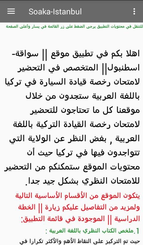 ان تطبيق سواقة اسطنبول هو الأول من نوعه للتحضير لامتحان الحصول على شهادة ورخصة القيادة التتركية باللغة العربية حيث أنه يحتوي كل ماتحتاجونه لذلك من ملخص للكتاب العربي , ونماذج امتحانات سابقة مترجمة الى اللغة العربية بطريقة ممتازة ومحضرة بعدة طرق حيث تمت ترجمت النماذج امتحانات شهادة السواقة للسنوات السابقة من اللغة التركية الى اللغة العربية وتحضيرها باللغة العربية فقط بهدف التدريب السريع, اضافة لذلك فقد تم تحضير جزء من النماذج بطريقة مشابهة للامتحان الفعلي الخاص برخصة القيادة التركية حيث أنه في الامتحان الفعلي يبقى السؤال باللغة التركية ويتم الوصول للترجمة من خلال زر خاص بالترجمة لكل سؤال على حدا ومن خلال النماذج هذه ستتمكننون من قياس الوقت اللازم لانهاء قراءة الأسئلة والاجابة عليها ضمن المدة الزمنية المحددة وهي 45 دقيقية .