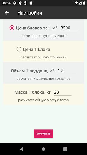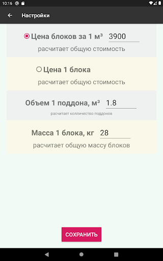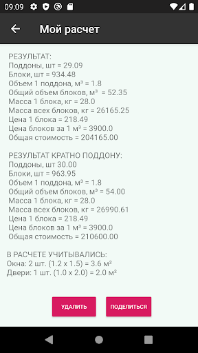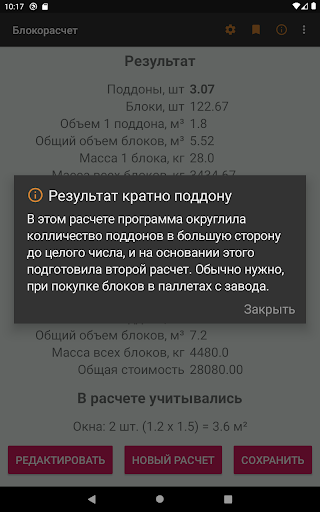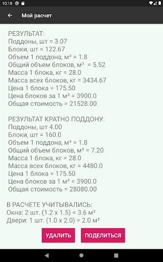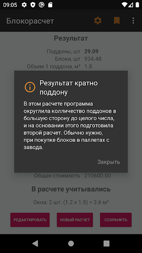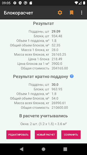 * একটি একাধিক প্যালেট - এই গণনার মধ্যে, প্রোগ্রামটি একটি পূর্ণসংখ্যা পর্যন্ত সমগ্র পার্শ্বে প্যালেটগুলির সংখ্যাটি রাউন্ড করে এবং এর ভিত্তিতে প্রধানটি একটি বিকল্প গণনা করে। সাধারণত, কারখানা থেকে ব্লক কেনার সময় এই গণনাটি প্রয়োজন হয়, যখন বাল্কে নির্মাণ ব্লকগুলি কিনতে কোন সম্ভাবনা নেই।