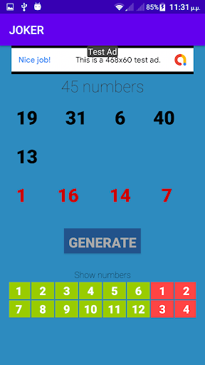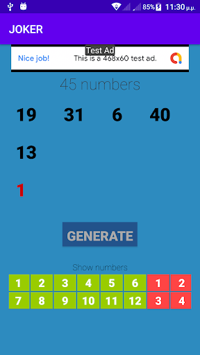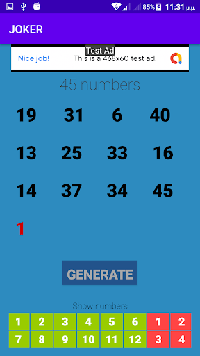 Random number generator between 1-45 and 1-20 numbers , for greek game joker ( ΤΖΟΚΕΡ ). Application use advance number generator engine.
