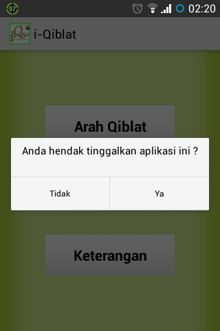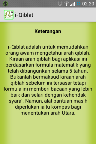 আই-কিবলা জনসাধারণকে কিবলট দিক জানাতে জনসাধারণকে সহজতর করার জন্য একটি অ্যাপ্লিকেশন।Qiblat এর নির্দেশনা 5 বছর ধরে উন্নত একটি গাণিতিক সূত্রের উপর ভিত্তি করে এই অ্যাপ্লিকেশনের জন্য গণনা করা হয়।এর অর্থ এই নয় যে ক্বিব্লার নির্দেশের অনুপাতটি পূর্বে মিস করেছে কিন্তু এই সূত্রটি একটি ভাল পড়ার এবং syara এর ইচ্ছার সাথে সমান্তরাল দেয়।যাইহোক, সাহায্য সরঞ্জামটি এখনও প্রয়োজন যা উত্তরটি নির্ধারণ করতে কম্পাস।