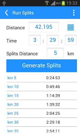 Here you can split a target time in custom intervals, e.g. you can find the time you must run every 5 km to beat your PB in marathon.