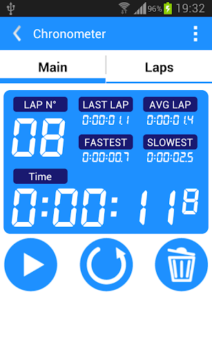 A complete running chronometer, with laps storage, average lap, slowest lap, fastest lap...