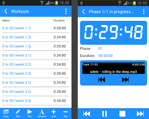 Here you can create and run a "workout": a training session made of one or more phases associated with a music or a vocal message (also auto-recorded).