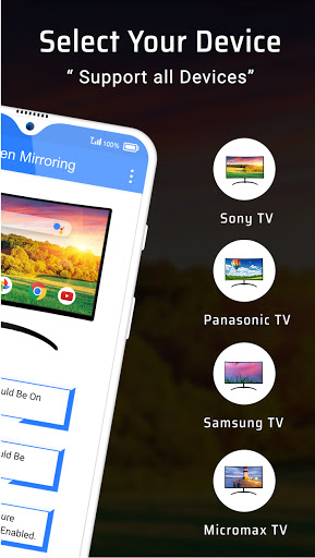 টিভির সাথে এই পর্দায় মিররিং দ্বারা সমর্থিত বিভিন্ন ব্র্যান্ড - মোবাইল সংযোগ টিভির স্যামসাং টিভি, ভিজিও টিভি, সোনি টিভি, ইত্যাদি স্ক্রিন মিরর করছে।