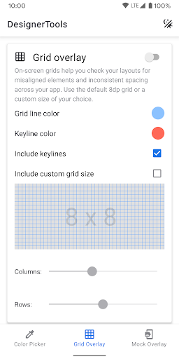 গ্রিড ওভারলে-বেমানান ব্যবধান বা ভুল-সংযুক্ত উপাদানগুলির জন্য লেআউটগুলি পরীক্ষা করতে অন-স্ক্রিন গ্রিডগুলি দ্রুত টগল করুন। এমনকি আপনি গ্রিডের আকার, গ্রিড লাইন এবং কীলাইন রঙগুলি কাস্টমাইজ করতে পারেন