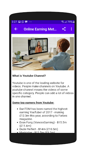 এই অ্যাপ্লিকেশনে আমরা আপনার নিজের YouTube চ্যানেল তৈরি করে YouTube থেকে অর্থ উপার্জন করতে কিভাবে নির্দেশনা দিয়েছি। এছাড়াও আপনি ফেসবুকের মতো সোশ্যাল মিডিয়া ওয়েবসাইট থেকে অর্থ উপার্জন করতে পারেন। মানুষ ব্লগ থেকে অনলাইনে অর্থ উপার্জন করছে। তারা গুগল অ্যাডসেন্স থেকে উপার্জন করতে পারেন। অনেক মানুষ ফ্লিপ্পা থেকে অনলাইনে অর্থ উপার্জন করে। কিছু মানুষ niche ওয়েবসাইট থেকে অর্থ উপার্জন। আমরা সহজ এবং সহজ উপায়ে দ্বারা অনলাইন উপার্জন এই পদ্ধতি ব্যাখ্যা করার চেষ্টা করেছি।
