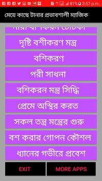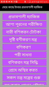 এবার যাকে বশ করতে চান, সে যখন খালি পায়ে কোথাও হেটে যায় তখন তার পা লক্ষ করুন, এবং তার ডান পায়ের নিচের মাটি তুলে নিয়ে আসুন এবং উপরক্ত মন্ত্রটি ১১ বার উচ্চারন করে মন্ত্রপূত করুন, এবং সুযোগ বুঝে তার মাথায় ছিটিয়ে দিন, দেখুন কয়েকদিনের মধ্যে সেই মেয়ে একান্তই আপনার হয়ে যাবে।। বিঃ দ্রঃ মন্ত্রের যেখানে পমিক লেখা ..