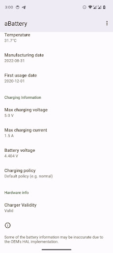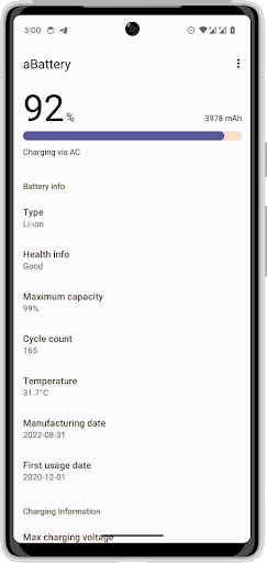 - সর্বশেষতম অ্যান্ড্রয়েড 14 এপিআইয়ের সাথে সামঞ্জস্যতা, আপনাকে ব্যাটারি স্বাস্থ্য সম্পর্কিত বিশদ তথ্য সরবরাহ করে, সর্বাধিক সরবরাহ করেক্ষমতা, উত্পাদনের তারিখ এবং আরও অনেক কিছু।