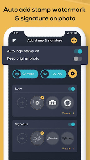 এই অ্যাপে, যদি আপনি স্বয়ংক্রিয় লোগো স্ট্যাম্প বিকল্পটি চালু করেন তবে আপনার ক্যামেরা থেকে একটি ফটো ক্লিক করার সময় আপনার লোগো বা স্বাক্ষর স্বয়ংক্রিয়ভাবে যোগ করা হবে।
