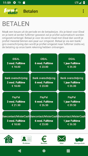Farm Date is zeer betaalbaar en je bent altijd zelf in controle. Wij hanteren geen automatische incasso’s. Je kunt via je profiel betalen met iDEAL, Bancontact, bankoverschrijving of Pay Pal. Je profiel wordt niet automatisch verlengd. Als je full time deelname termijn is afgelopen gaat je profiel automatisch terug naar een aspirant deelname. Je hebt dan zelf in de hand of je nog eens een full time deelnemer wilt worden.