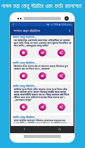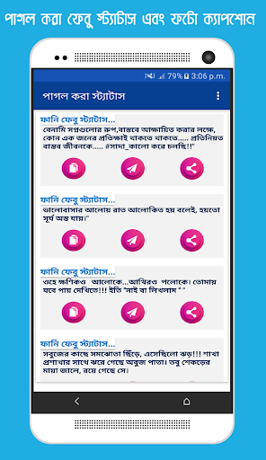 ফেববুক স্ট্যাটাস এই অ্যাপটির মাধ্যামে আপনি আপনার পছন্দ মতো সকল স্ট্যাটাস গুলো অতি সহজে সবার সাথে শেয়ার করতে পারবেন । এই অ্যাপটিতে রয়েছে বিখ্যাত ব্যাক্তিদের উক্তি, রয়েছে সেরা সকল বাছাইকৃত Status, Famous Quotes, Romantic Status, Funny Status in Bangla সহ আরও অনেক এসএমএস।আশা করি এই অ্যাপ্লিকেশনটি থেকে আপনি আপনার পছন্দের স্ট্যাটাসটি খুঁজে পাবেন।